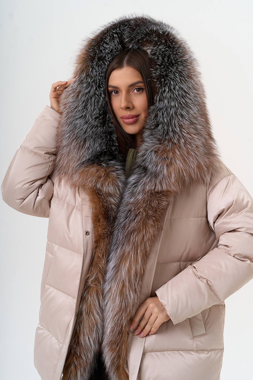 Крой воротника - капюшон, отделка блюфрост